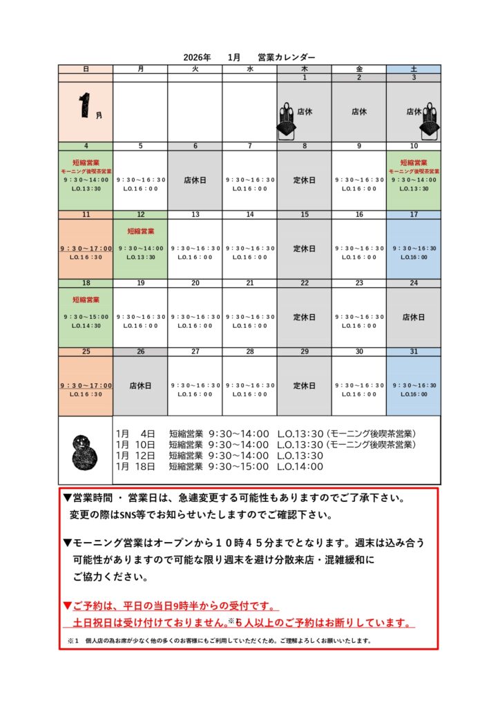 投稿日: 2026年1月3日 投稿者: masasix5933@gmail.com2026年1月の営業日のお知らせです。 MERCY’sCOFFEE店長のマーシーです(*^^*) あけましておめでとうございます。 昨年はご来店ありがとうございました。 本年も変わらぬご愛顧をよろしくお願いいたします さて、遅くなりましたが1月の営業日、営業時間のご案内です。 ご来店の際はご確認よろしくお願いします。